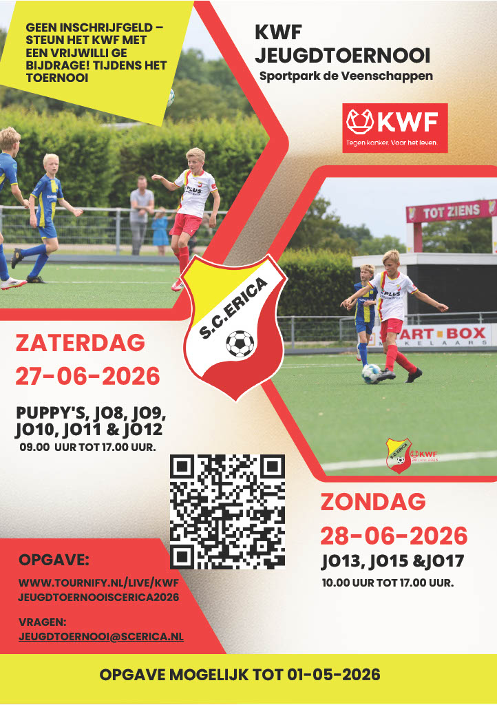 Aanmelden kan via QR code in de flyer of via de volgende link: www.tournify.nl/live/kwfjeugdtoernooiscerica2026